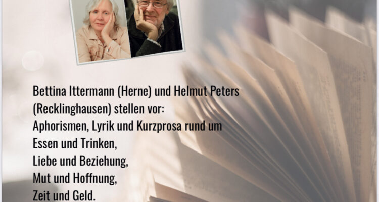 Aphorismen, Lyrik und Kurzprosa rund um Essen und Trinken, Liebe und Beziehung, Mut und Hoffnung, Zeit und Geld Donnerstag, 26. März 17 Uhr Eintritt 15€ inklusive einer Brotzeit oder eine Tasse Kaffee und ein Stück Torte Anmeldung unter: 02361 / 3038808 über WhatsApp 015901571422 oder direkt vor Ort: Kärntenerstraße 30